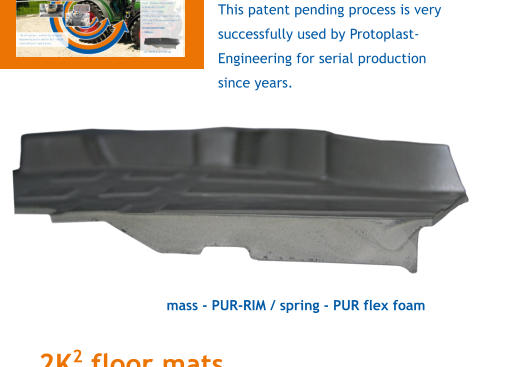 2K2 floor mats mass - PUR-RIM / spring - PUR flex foam Protoplast-Engineering continuously develops new technologies for PUR-processing. This has been resulting in the 2K2-process for manufacturing floor mats for vehicle cabins. The major advantage here is – similar to the modern 2K-injection molding - that two different materials merging in a single tool into one product. This patent pending process is very successfully used by Protoplast-Engineering for serial production since years. Features:  • Outstanding elongation of break • Optimal resistant to abrasion • Chemically resistant • Neat surface finish • Protected against water absorption • VOC and FOG numbers to highest standards • Optimal sound absorption thru „mass – spring system“ • Customized surface coloring and texturing